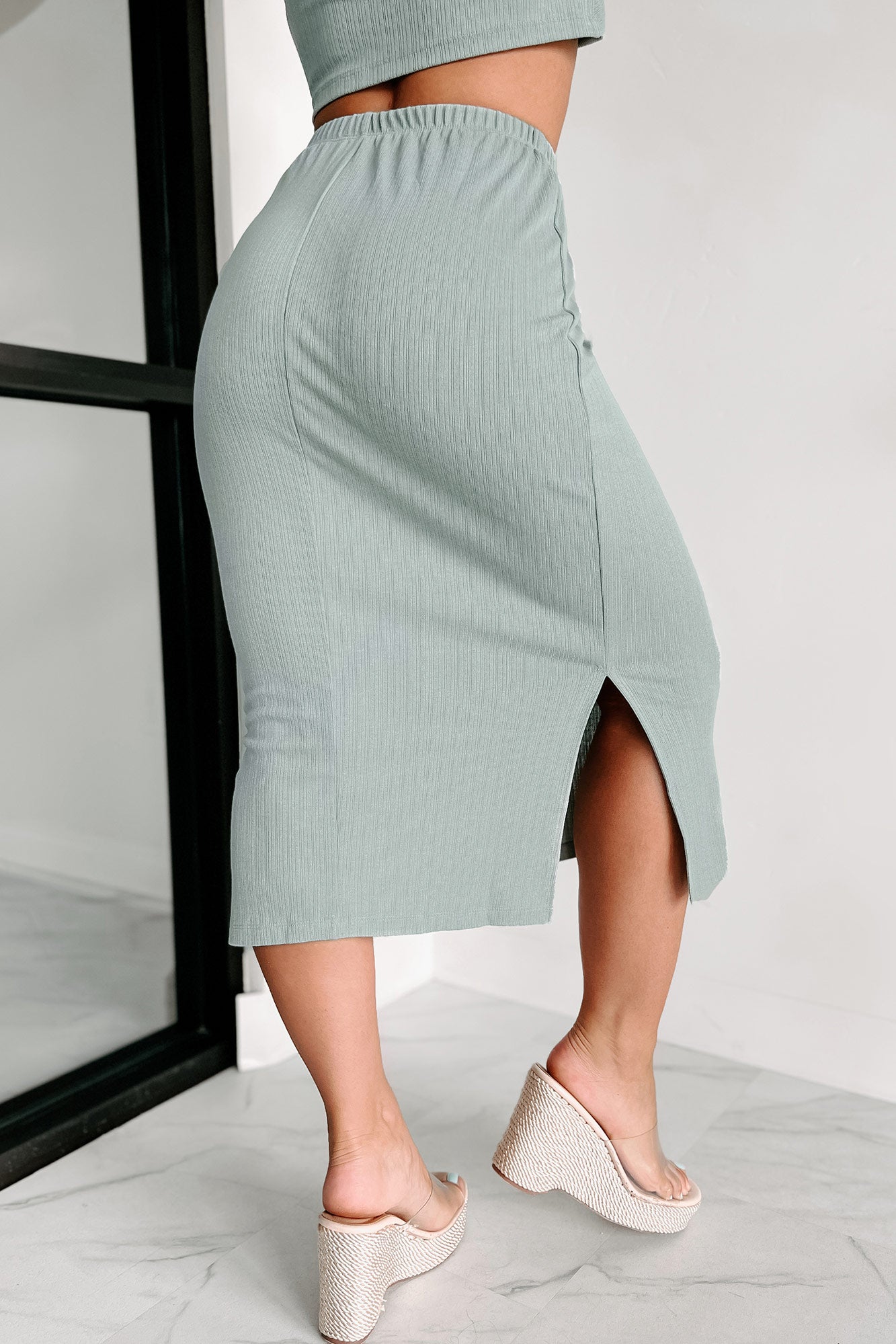 - Skirt: Elastic Waistband, Side Slits, Midi Length